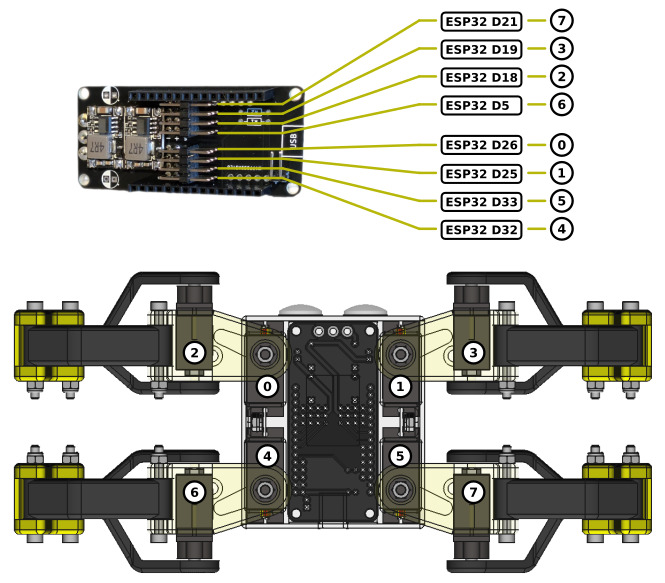 Since many people have asked me about how to connect the servos to the PCB, I’m sharing a diagram below showing the default wiring configuration. Of course, you can wire it any other way that’s more convenient for your setup if you’re using your own code.
